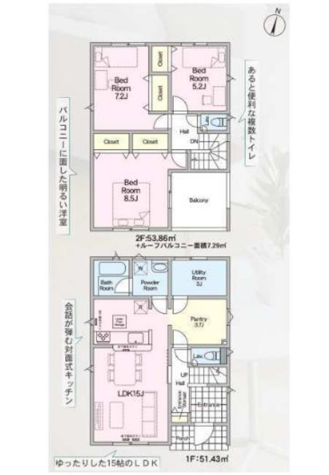 | 間取内訳 | 1F:LDK15帖 2F:洋室8.5帖、洋室7.2帖、洋室5.2帖 | ||