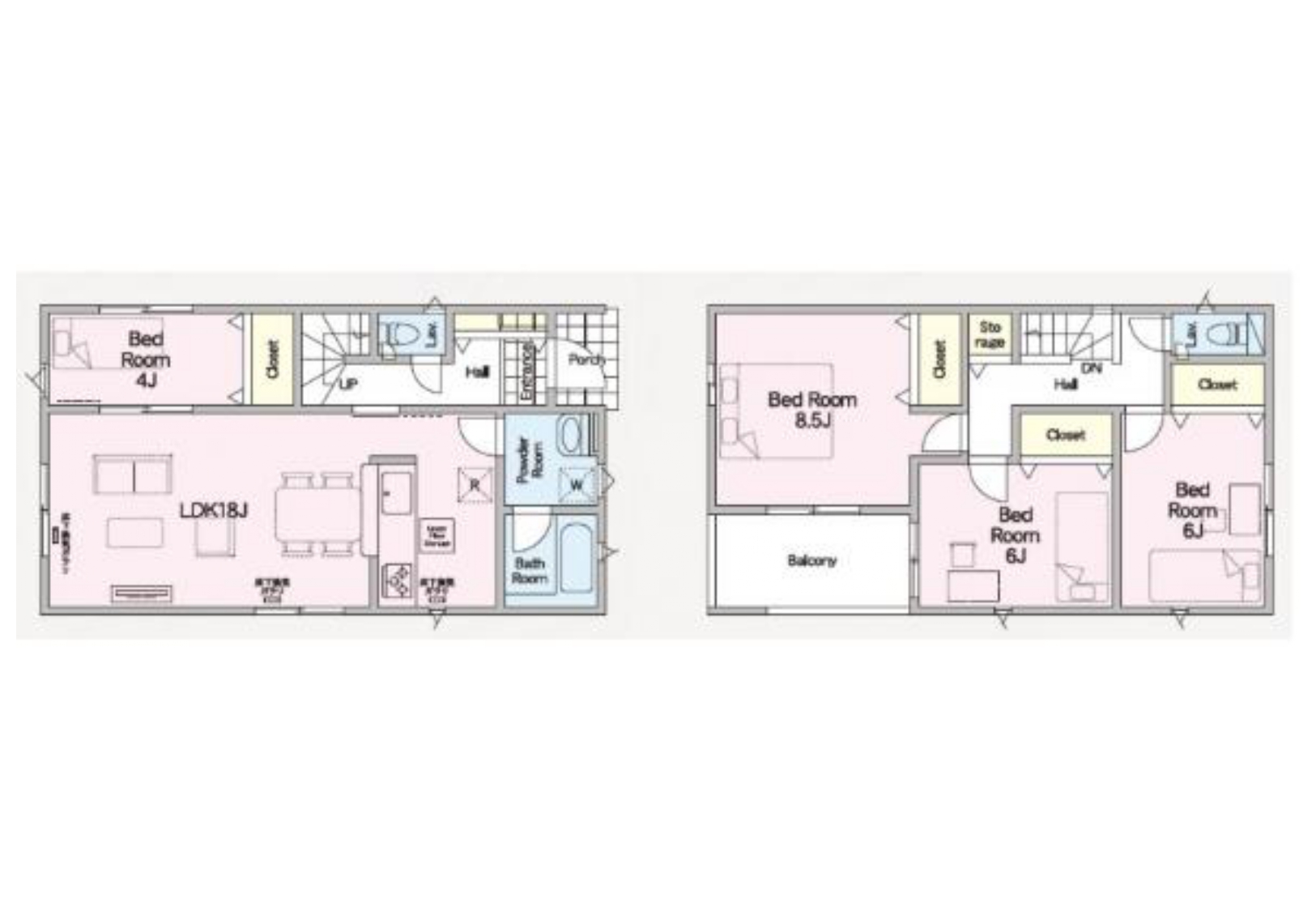 | 間取内訳 | 1F:LDK18.0帖 和室4帖 2F:洋室8.5帖 洋室6帖 洋室6帖 | ||