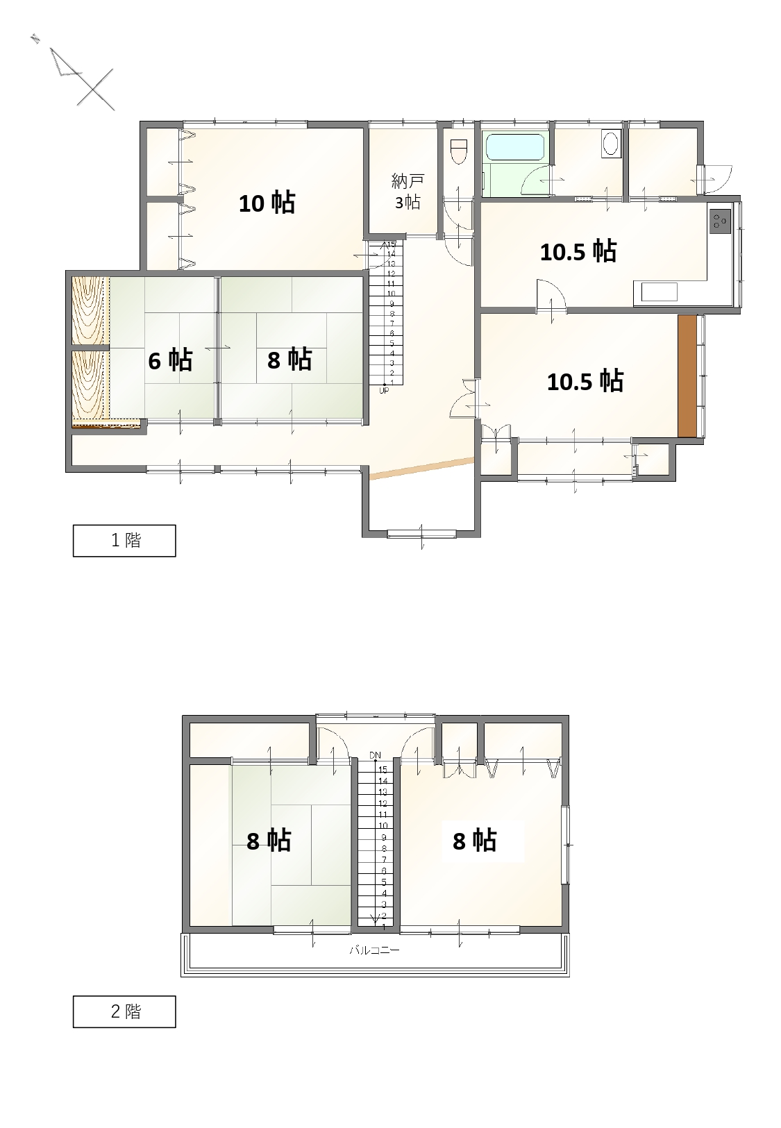 | 間取内訳 | 1F:LDK10.5帖、洋室10.5帖、洋室10帖、和室8帖、和室6帖 2F:和室8帖、洋室8帖 | ||