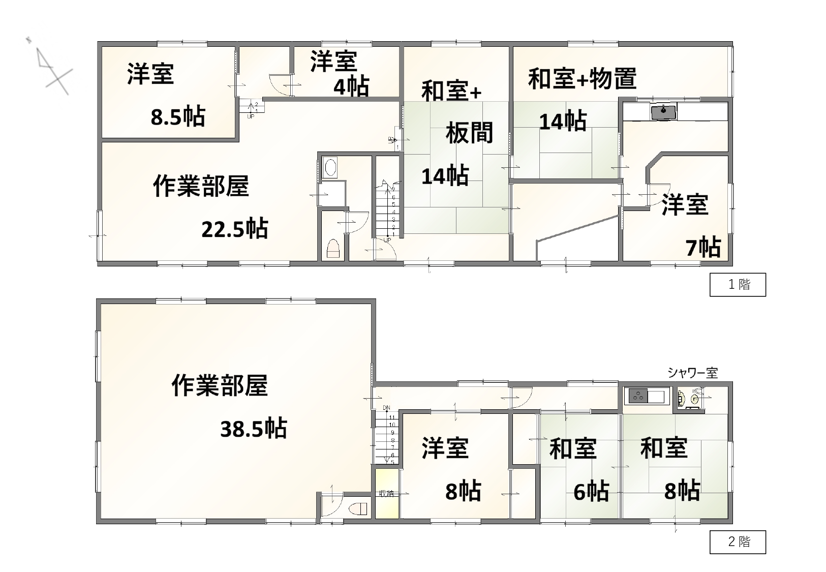 | 間取内訳 | 1F:DK7帖、和室14帖×2、洋室8.5帖、洋室4帖、作業部屋22.5帖 2F:洋室8帖、和室8帖、和室6帖、作業部屋38.5帖 | ||