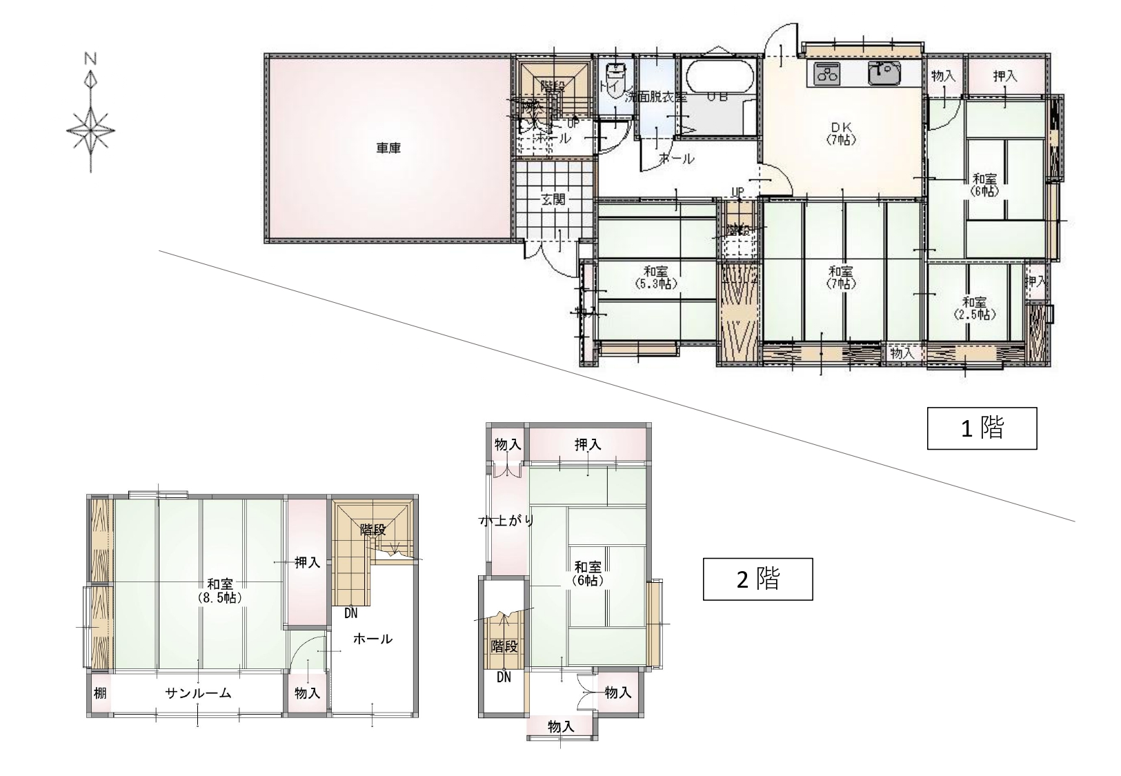 | 間取内訳 | 1F:DK7帖、和室7帖、和室6帖、和室5.3帖 2F:和室8.5帖、和室6帖 | ||