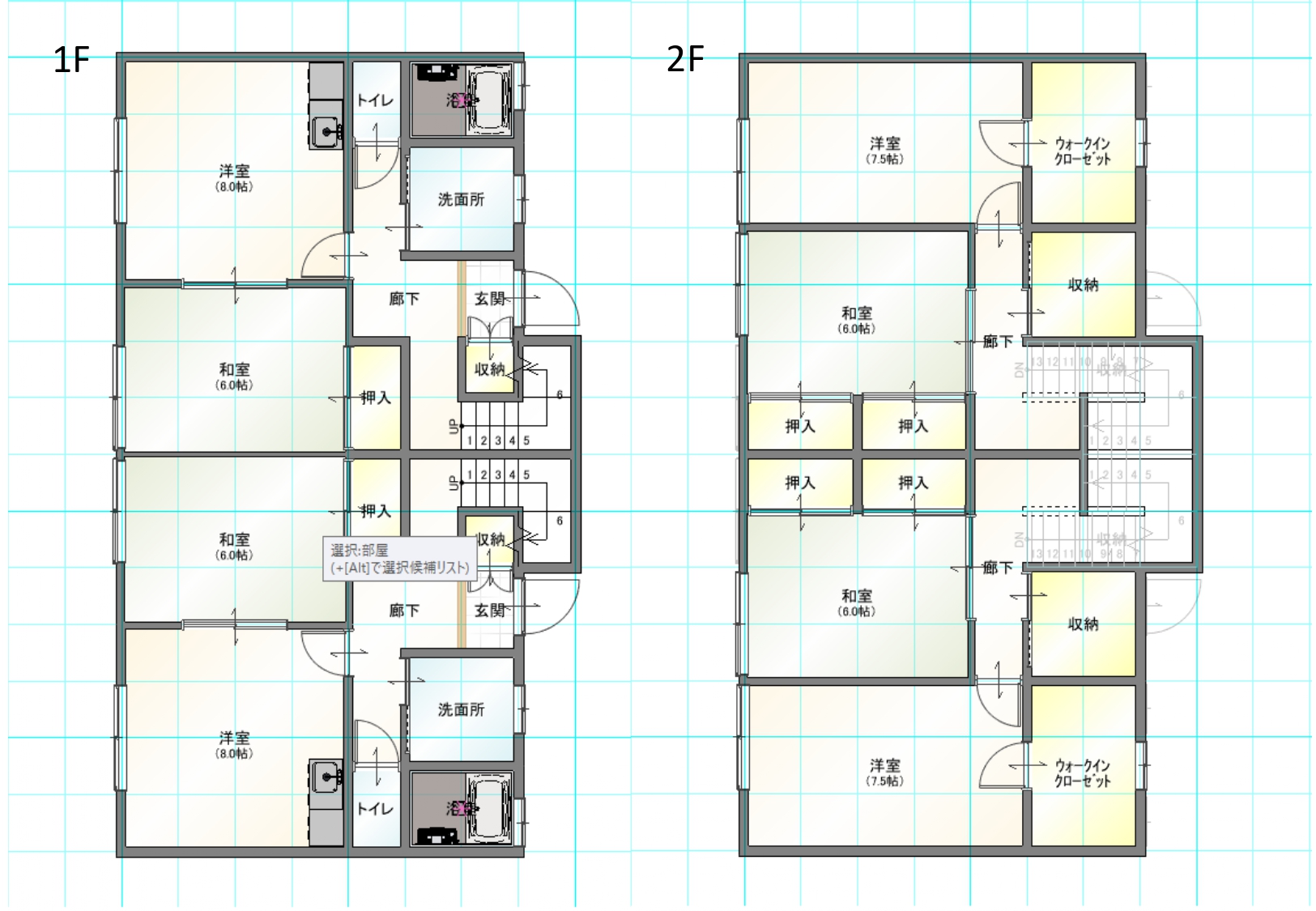 | 間取内訳 | 1F:LDK8帖、和室6帖 2F:和室7.5帖、和室6帖 ※集合住宅1戸の間取 | ||