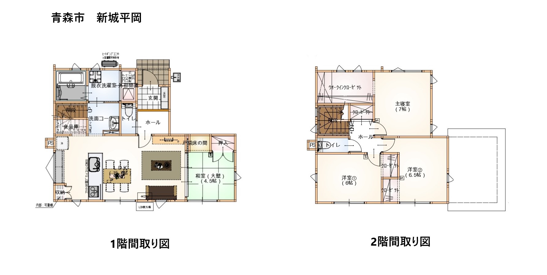 | 間取内訳 | 1F:LDK15.7帖、和室4.5帖 2F:洋室7帖、洋室6.5帖、洋室6帖 | ||