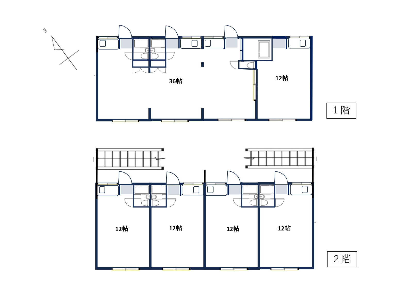 | 間取内訳 | 1階:36帖×1部屋、12帖×1部屋 2階:12帖×4部屋 | ||