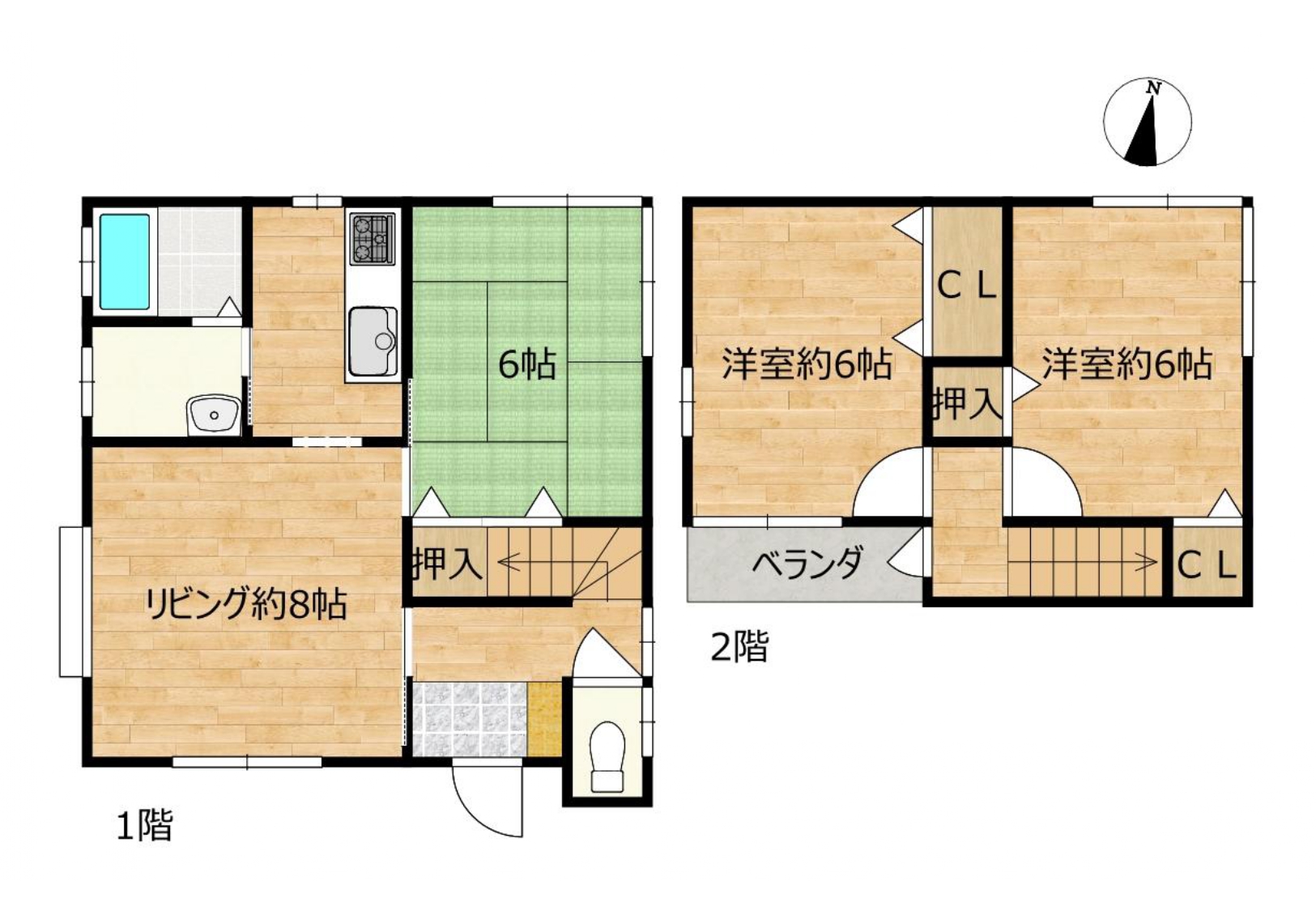 | 間取内訳 | 1階:リビング、6帖和室 2階:6帖和室×2 | ||