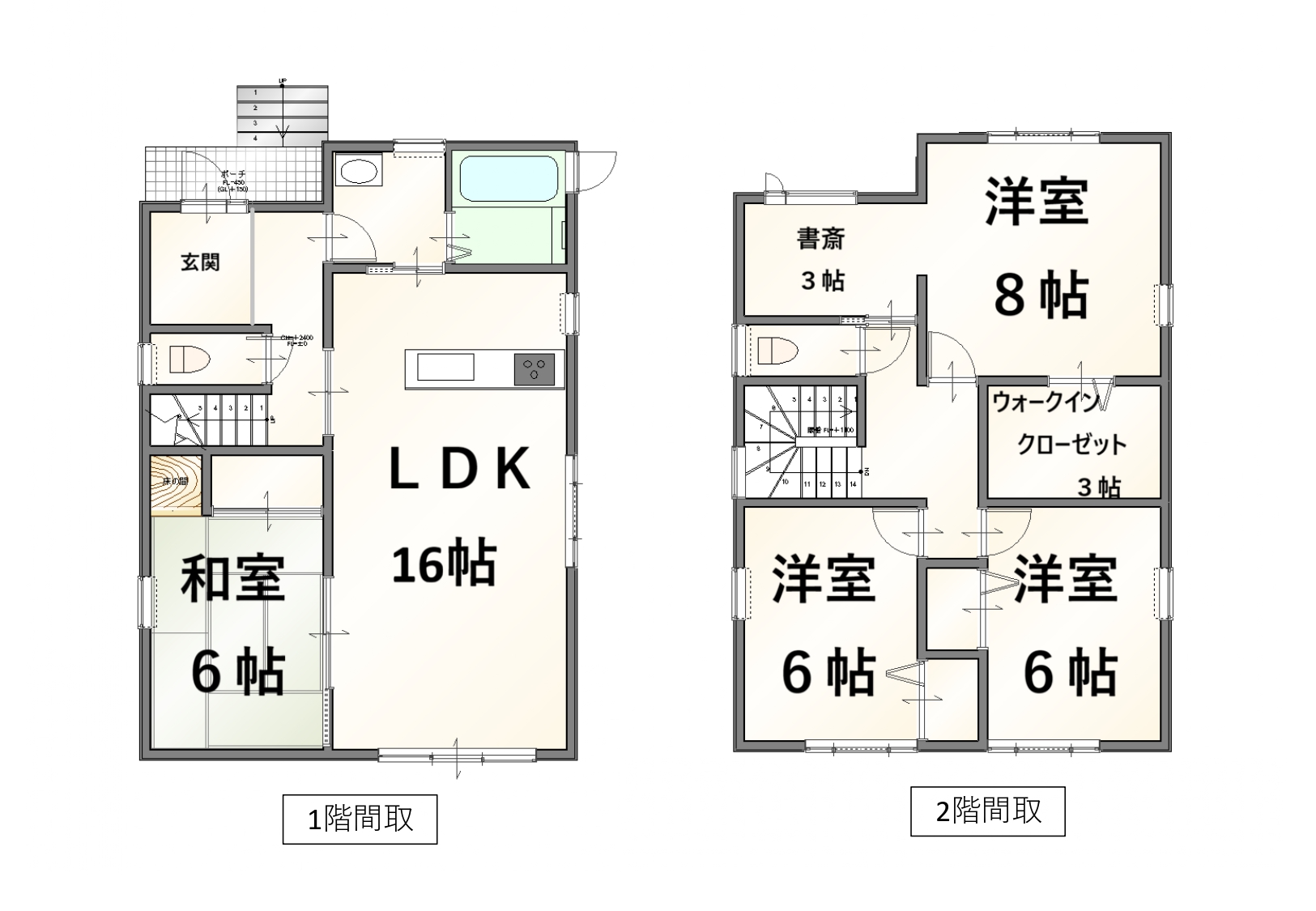 | 間取内訳 | 1F:LDK16帖、和室6帖 2F:洋室8帖、洋室6帖×2 | ||