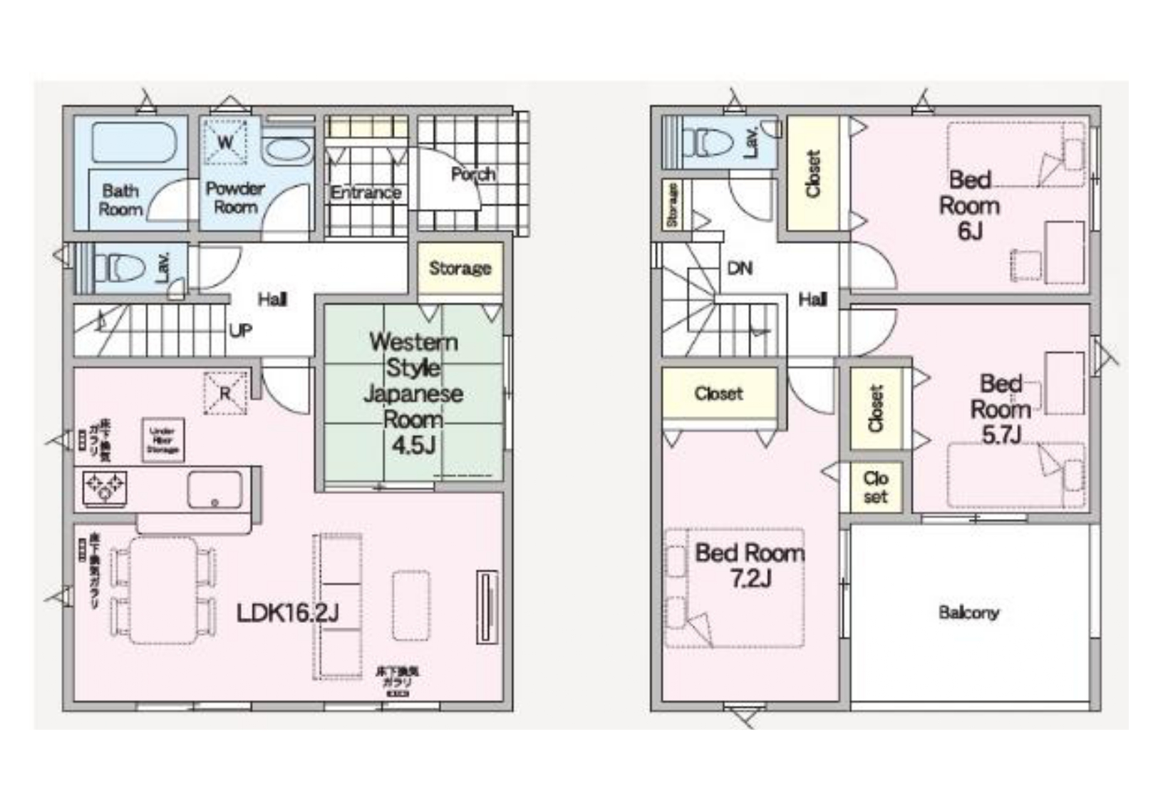 | 間取内訳 | 1階:LDK16.2帖、和4.5帖 2階:洋7.2帖、洋6帖、洋5.7帖、バルコニー | ||