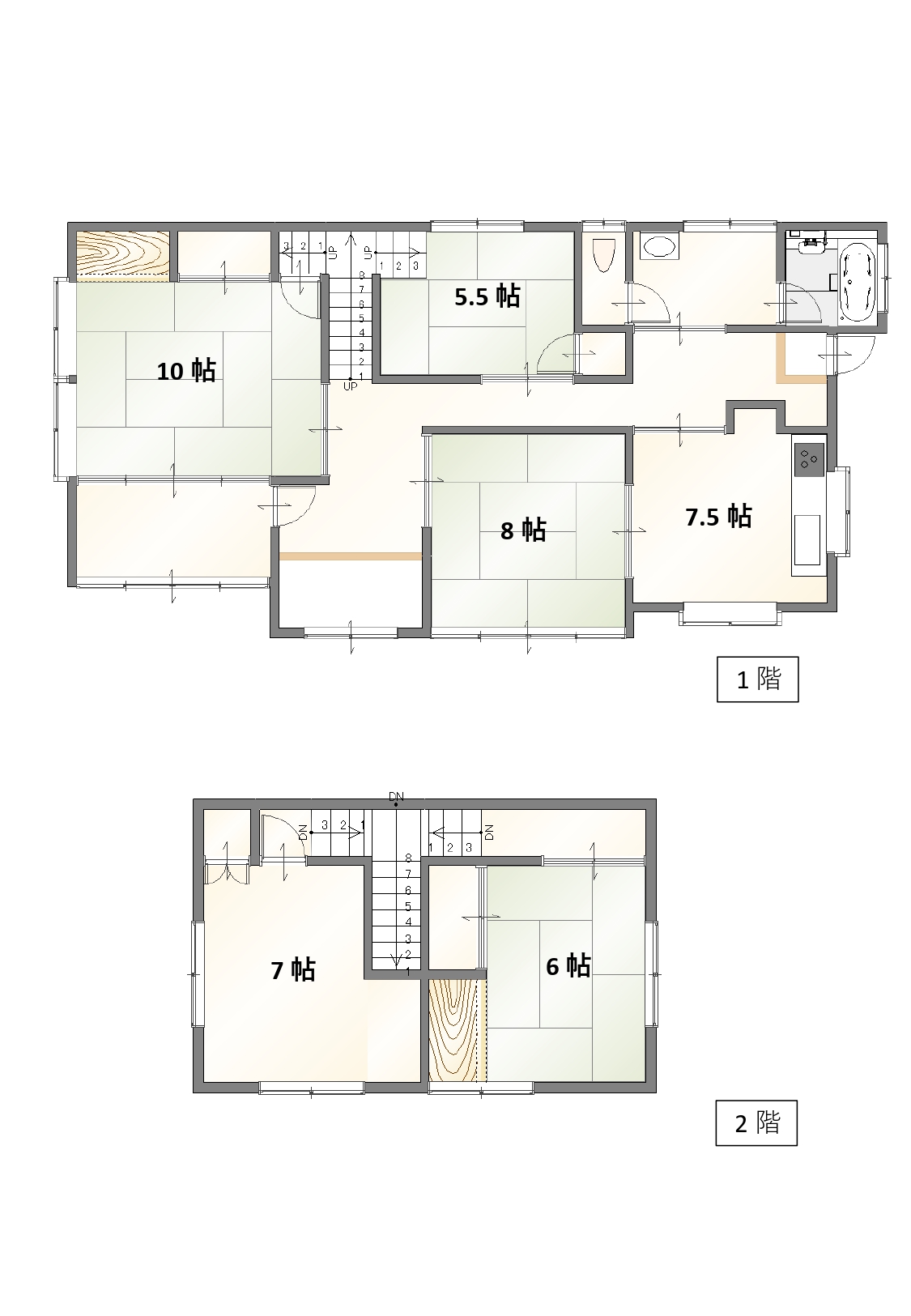 | 間取内訳 | 1F:DK7.5帖、和室10帖、和室8帖、和室5.5帖 2F:洋室6帖、和室6帖 | ||